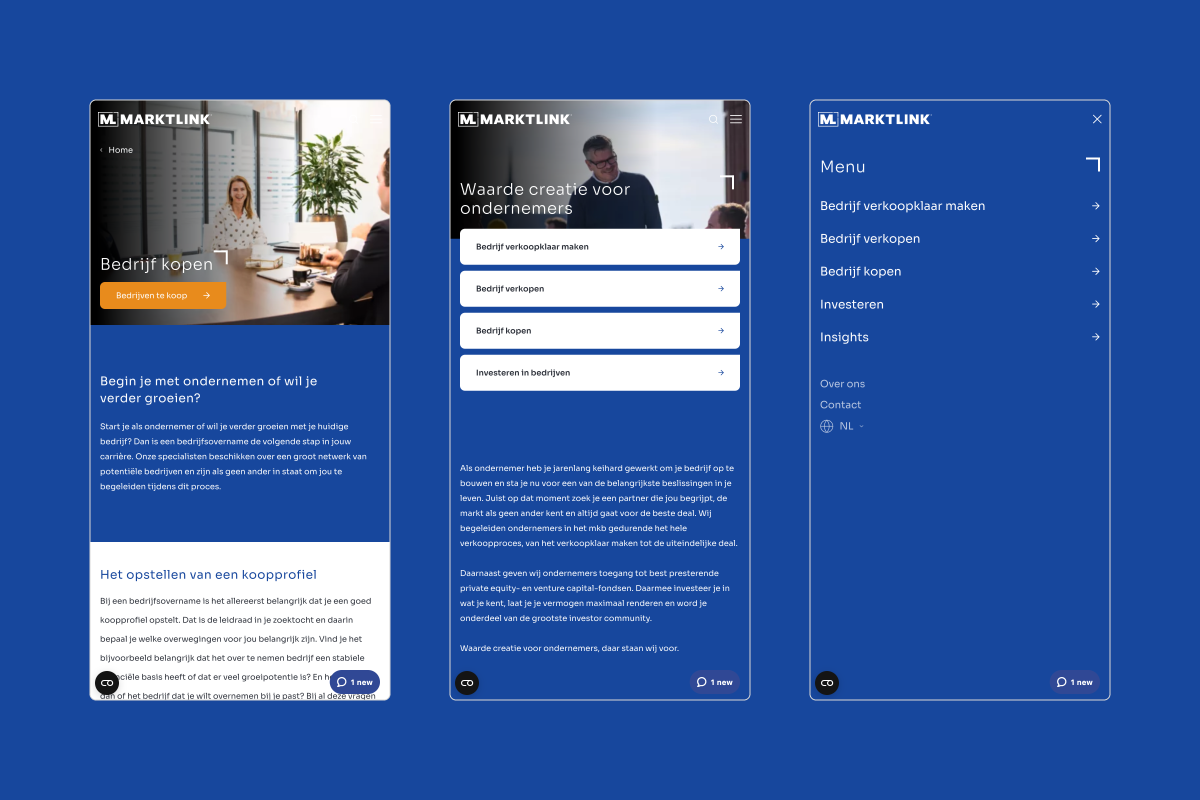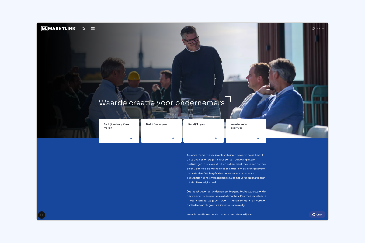 Het project is ontstaan uit de behoefte van Marktlink, een snelgroeiend bedrijf in de fusie- en overnamemarkt, om een moderne online aanwezigheid te creëren die aansluit op hun nieuwe branding en propositie. Met de ambitie om hun diensten uit te breiden naar verschillende landen, was het essentieel om een toekomstbestendige omgeving te bouwen die snel kon worden uitgerold in diverse markten.